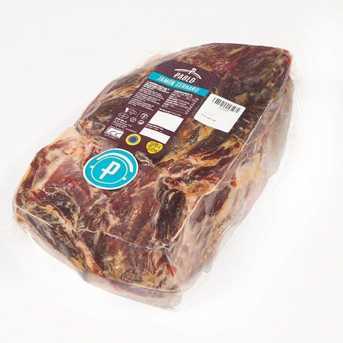 Deshuesamos, limpiamos y prensamos los jamones, y los envasamos al vacío. Se obtiene un formato de alto rendimiento para el loncheado, con un mínimo desperdicio, conservando el aspecto y forma natural de la loncha. El corte de este producto se recomienda hacerlo a máquina. Estas piezas tienen un peso de 5 a 6kg.