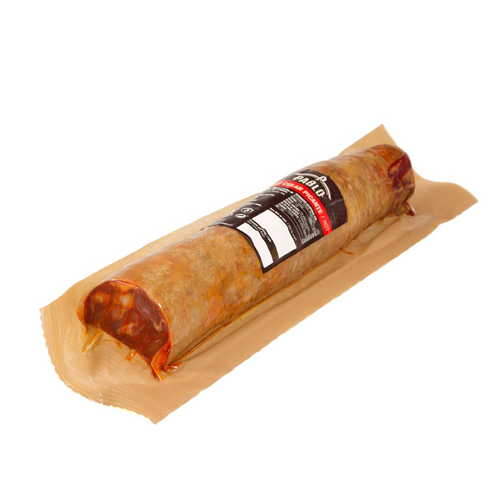 Mitades de la pieza original con un tamaño más grueso de la pieza y de la piel (natural en nuestro caso) que se usa en estos chorizos permite un corte más uniforme y fino. El peso de esta pieza en formato dulce y picante está en torno a 800g.