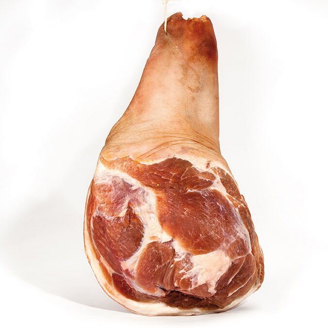 Lacón seleccionado cuidadosamente y con un adecuado punto de salazón. Procede de la pierna delantera del cerdo. Se trata de piezas de unos 3kg, saladas tradicionalmente y con un periodo de oreo en secadero natural durante el que se les aplica un ligero ahumado para dar el sabor tan característico.