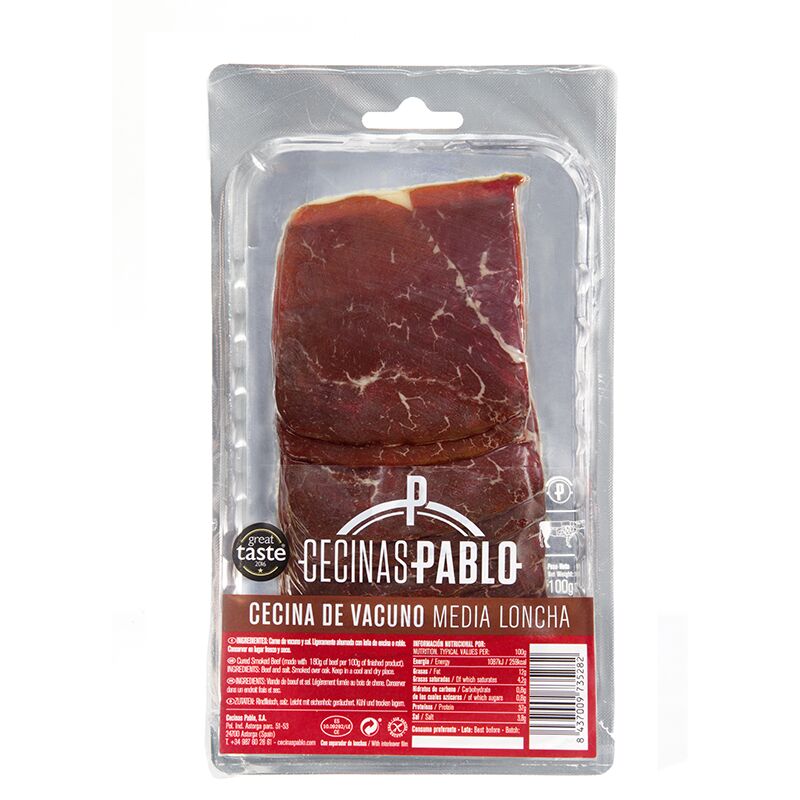 En este caso presentamos nuestra cecina loncheada en el actual formato de media loncha,, envasadas al vacío mediante el sistema skin, que proporciona la mejor conservación y presentación posible del producto y la menor pérdida de aroma y sabor. En todos nuestros loncheados incluimos separador de lonchas para facilitar el despegar unas lonchas de otras.
