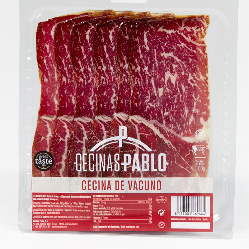 En este caso presentamos nuestra cecina loncheada en barquetas de 100g, envasadas al vacío mediante el sistema skin, que proporciona la mejor conservación y presentación posible del producto y la menor pérdida de aroma y sabor. En todos nuestros loncheados incluimos separador de lonchas para facilitar el despegar unas lonchas de otras.