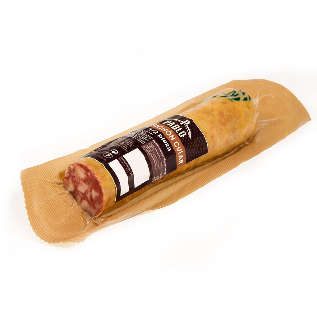 Mitad de la pieza original con un tamaño más grueso de la pieza y de la piel (natural en nuestro caso) que se usa en este salchichón permite un corte más uniforme y fino. El peso de esta pieza en este medio formato está en torno a 800g.